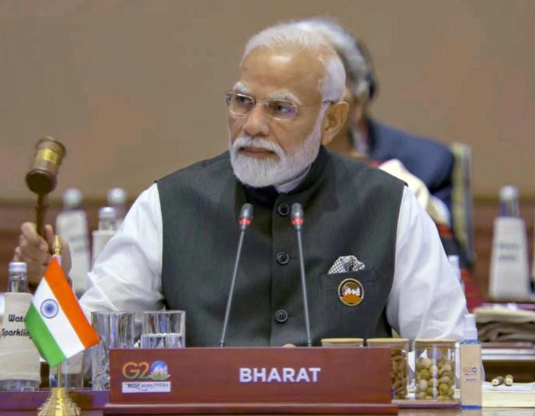 আজ শনিবার নয়াদিল্লির প্রগতি ময়দানের ভারত মণ্ডপম কনভেনশন সেন্টারে জি২০ শীর্ষ সম্মেলনের উদ্বোধনী অনুষ্ঠানে উদ্বোধনী বক্তব্য দেন ভারতের প্রধানমন্ত্রী নরেন্দ্র